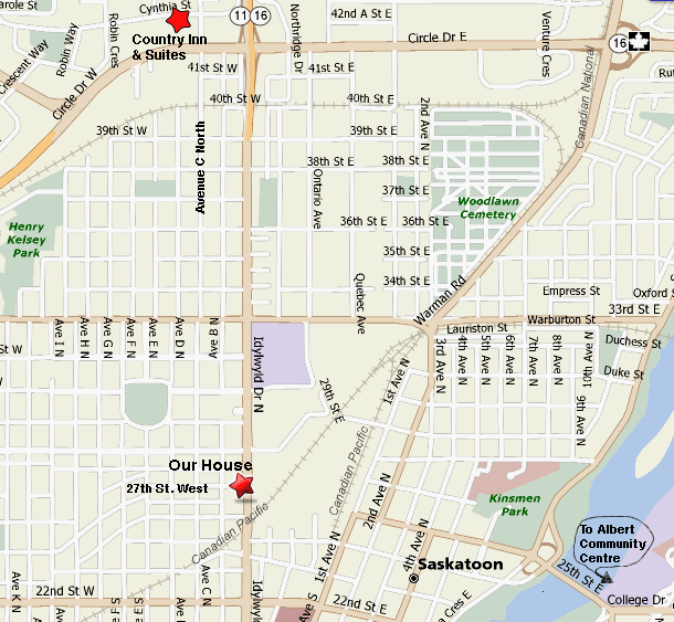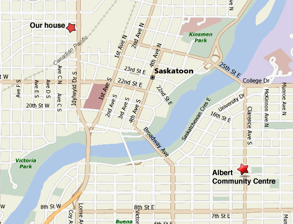 Here's a map that shows downtown Saskatoon, our house, and the Albert Community Centre (on the corner of Clarence and 12th, several blocks north of 8th Street).
